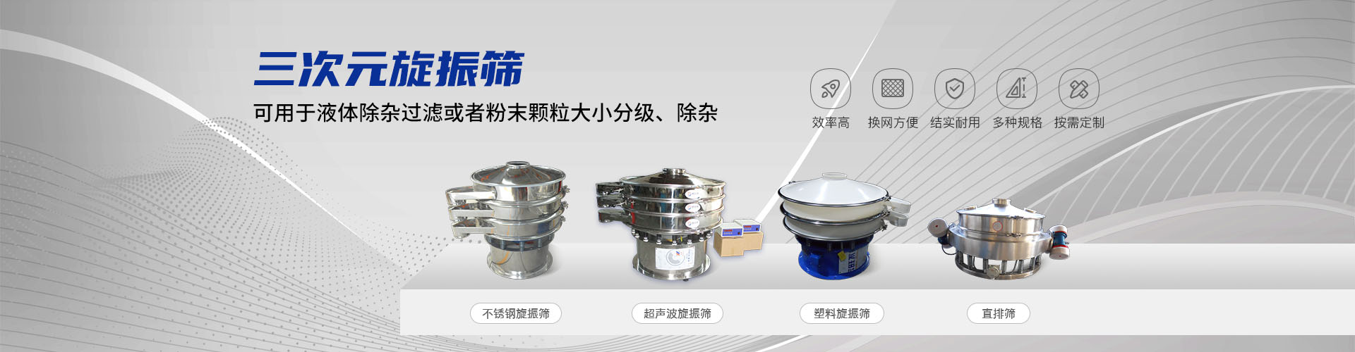 公司的主要產品有:三次元旋振篩、直線振動篩、圓形搖擺篩、方形搖擺篩、脫水篩、超聲波振動篩、塑料振動篩、直排篩、高頻篩、450過濾篩、實驗篩、斗式提升機、皮帶輸送機、過濾器、振動電機等,